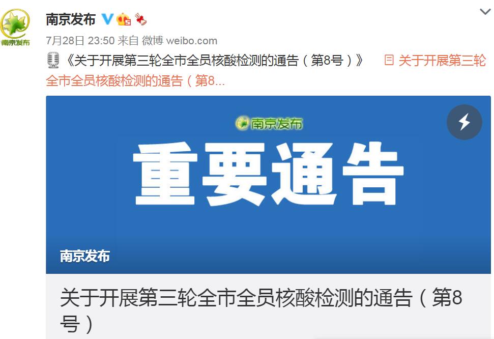 來源:“南京發(fā)布”微博檢測范圍:全市范圍內(nèi)全部居民(含暫住人...